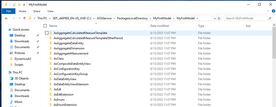 A mais importante é a pasta com o nome da sua Model, as subpastas dentro dela representam todos os objetos que podem ser criados dentro do Dynamics 365 FO. Conforme você for desenvolvendo seus objetos serão adicionados arquivos .xml com a suas definições.