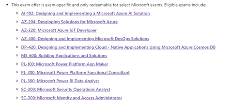 Os desafios geralmente contêm uma lista de exames elegíveis e cada exame é vinculado a uma trilha de certificação do Microsoft Learn. Completando a trilha até a data final do desafio você receberá no e-mail o voucher para o exame escolhido.